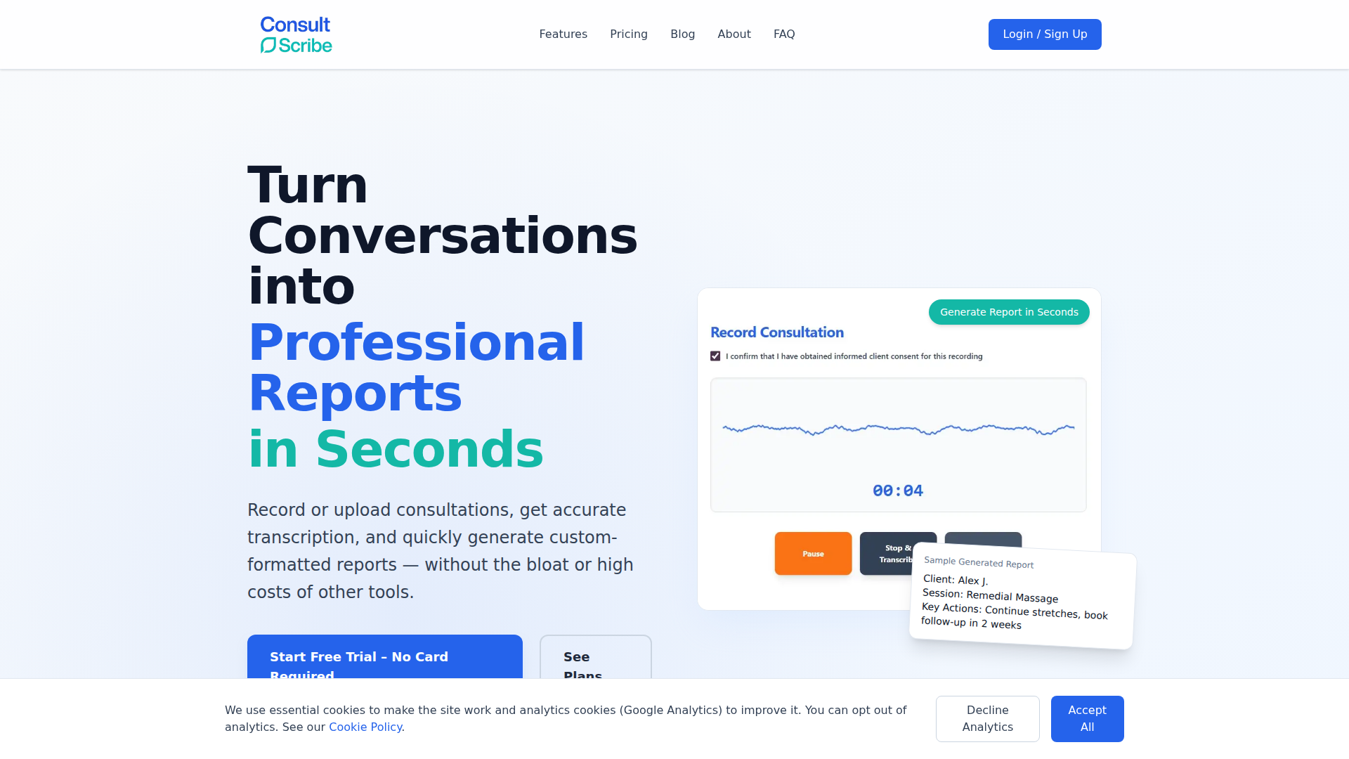 ConsultScribe is an AI-powered tool designed for professionals to quickly transcribe consultations or meetings and generate polished, custom reports. It streamlines the workflow by converting audio recordings into accurate transcripts and formatting them into structured documents such as SOAP notes, summaries, or action plans. Record or upload audio directly in the browser with real-time waveform feedback Create and customize templates using AI assistance, placeholders, and instructions Transcribe audio securely in under 2 minutes with high accuracy, including accent and noise handling Instantly generate professional reports in PDF or copy into your system The platform offers unlimited custom templates and fast report generation at an affordable price, starting from $10.50 AUD/month. It is ideal for healthcare providers, therapists, coaches, and other professionals seeking efficient note-taking and reporting solutions without unnecessary complexity or high costs. Pricing is based on operations (transcriptions and report generations), with a free trial providing 30 free operations. The tool emphasizes privacy, security, and ease of use, making it accessible for small practices and teams.