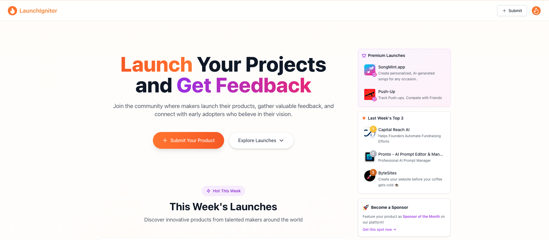 LaunchIgniter is designed to help creators, founders, and innovators transform ideas into successful launches. Whether itβs your very first MVP or your next big release, LaunchIgniter makes it effortless to showcase your product, attract early adopters, and gather meaningful feedback to fuel growth.With LaunchIgniter, you can:Showcase your product with a polished, professional profile.Connect with early users who love discovering and supporting new ideas.Collect valuable feedback to validate and refine your concept.Build lasting momentum before, during, and long after launch.Our vision is simple: launches should be more than announcements β they should spark conversations, build communities, and accelerate progress. From idea to ignition, LaunchIgniter is here to power every step of your journey.