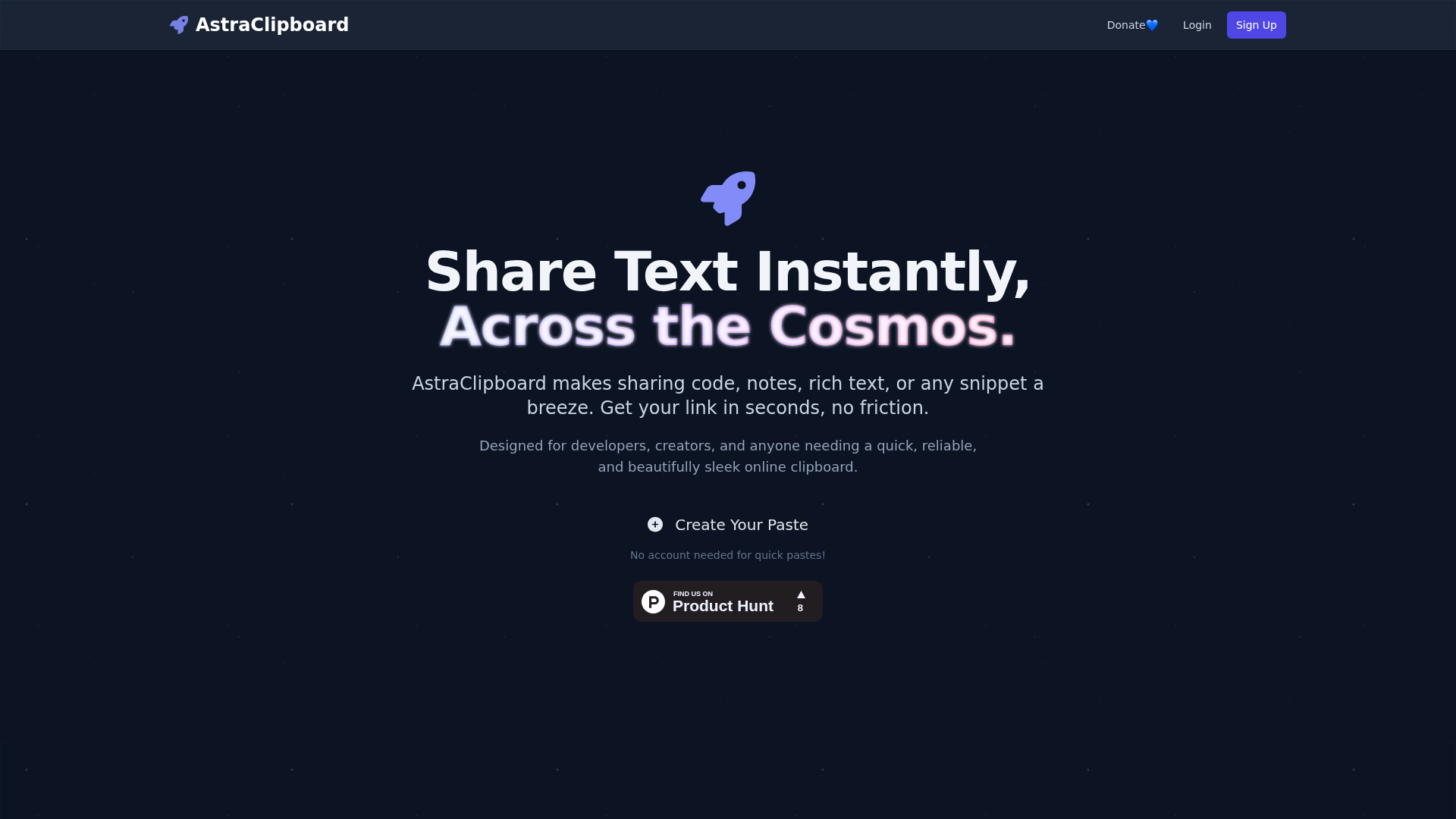 AstraClipboard is designed to be more than just a clipboard manager β itβs your personal space in the cloud where snippets, notes, and ideas stay safe, organized, and always within reach.Weβve all been there: copying something important, only to lose it a moment later. With AstraClipboard, your copied text, code snippets, and quick notes are stored securely and synced across devices. That means no more digging through files, messaging yourself links, or losing track of your thoughts.β¨ Key highlights:Cloud-based clipboard that works wherever you areSave, search, and organize your snippets with easeLightweight, distraction-free designPerfect for developers, writers, students, and anyone who loves staying organizedAstraClipboard is built with simplicity in mind, so you can focus on what really matters β your ideas. Think of it as a door that unlocks a faster, smoother workflow. π