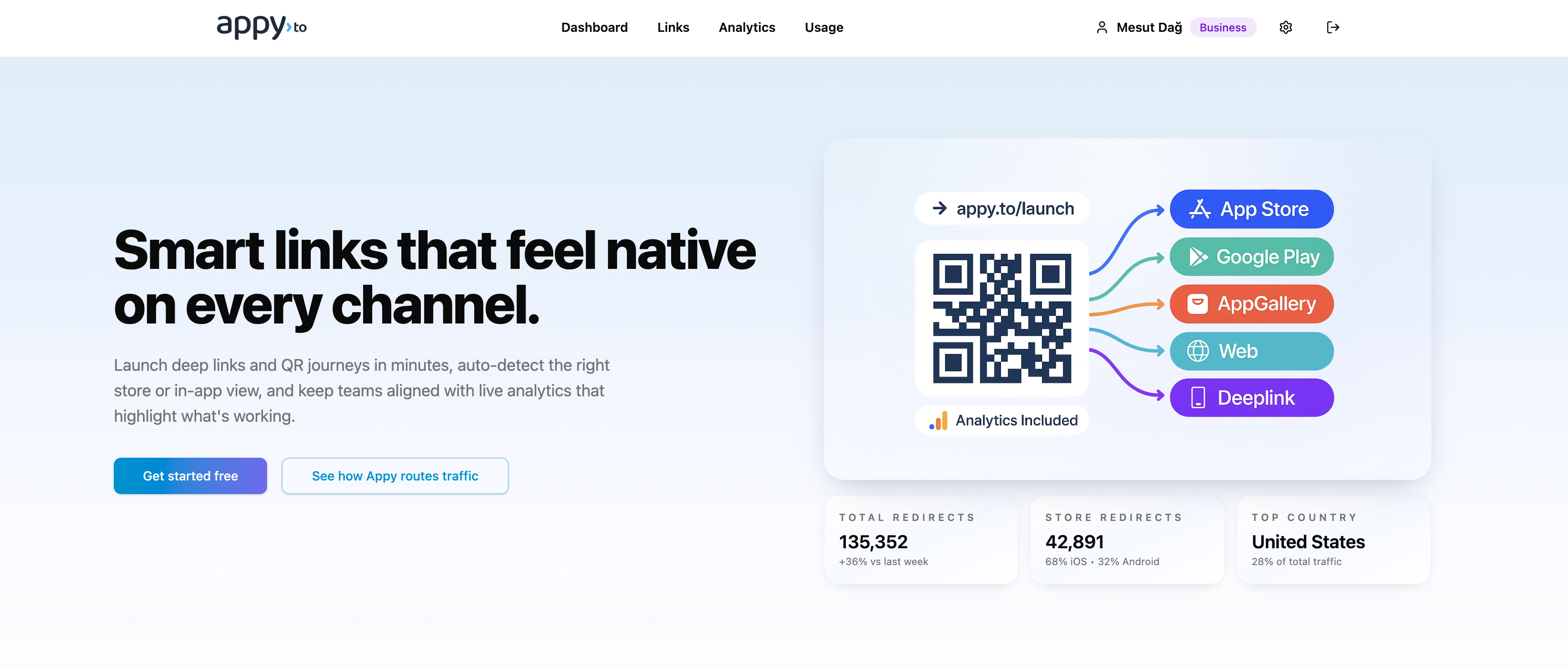 Appy.to is a mobile-first smart link and QR platform that helps developers and marketers simplify app installs, deep links, and tracking β all with a single link.Today, mobile app marketing is fragmented. Every campaign needs separate links for App Store, Google Play, and Huawei App Gallery, plus a different QR code for offline use. Deep links often break, analytics are missing, and with Firebase Dynamic Links shutting down, thousands of apps are left without a reliable alternative.Appy.to solves this.You create one smart link or QR code that automatically detects the userβs device and routes them to the correct store β or directly opens your app if itβs already installed. It also tracks every click, device type, country, and conversion in real time.Who itβs for:App developers who want seamless deep linkingMobile marketers running multi-platform campaignsE-commerce and gaming apps using QR codesAgencies managing installs and engagement for multiple clientsStartups and enterprises needing an easy Firebase migrationWhy we built it:We experienced firsthand how much time and conversion loss happens from broken links and inconsistent tracking. Appy.to was built to make mobile linking effortless β fast, accurate, and analytics-driven.With sub-50 ms redirects, custom-branded QR codes, deep-link landing pages, and transparent pricing, Appy.to bridges the gap between simple URL shorteners and overcomplicated enterprise tools.All platforms, one link β thatβs the idea behind Appy.to.