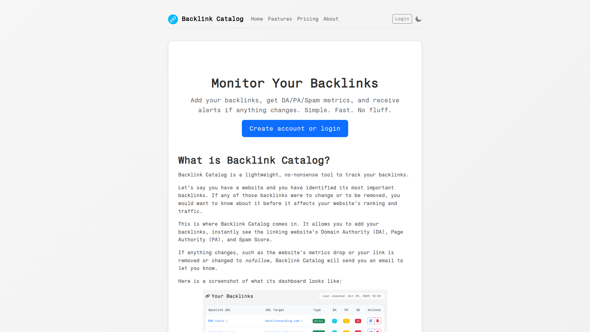 Backlink Catalog is a straightforward, lightweight tool designed to help website owners track their backlinks. It enables users to monitor important backlinks by adding them to the system and receiving alerts if any changes occur, such as drops in Domain Authority (DA), Page Authority (PA), Spam Score, or if links are removed or set to nofollow.Key features include:Adding and monitoring existing backlinksViewing linking website metrics (DA, PA, Spam Score)Automatic email alerts for metric changes or link removalsFlexible plans: free for up to 5 backlinks, paid plans for up to 500 backlinks at $12/month or $120/yearThe main functionality involves users inputting their known backlinks into the system, which then tracks these links' metrics over time. If any significant change occurs, the system promptly notifies the user via email, allowing proactive management of backlink profiles.This tool is ideal for SEO professionals, digital marketers, and website owners aiming to safeguard their search rankings by maintaining awareness of their backlink health. Its simple interface and alert system help users stay informed without unnecessary complexity or clutter.Pricing is based on a subscription model, with a free tier for monitoring up to 5 backlinks and affordable paid options for larger backlink profiles.