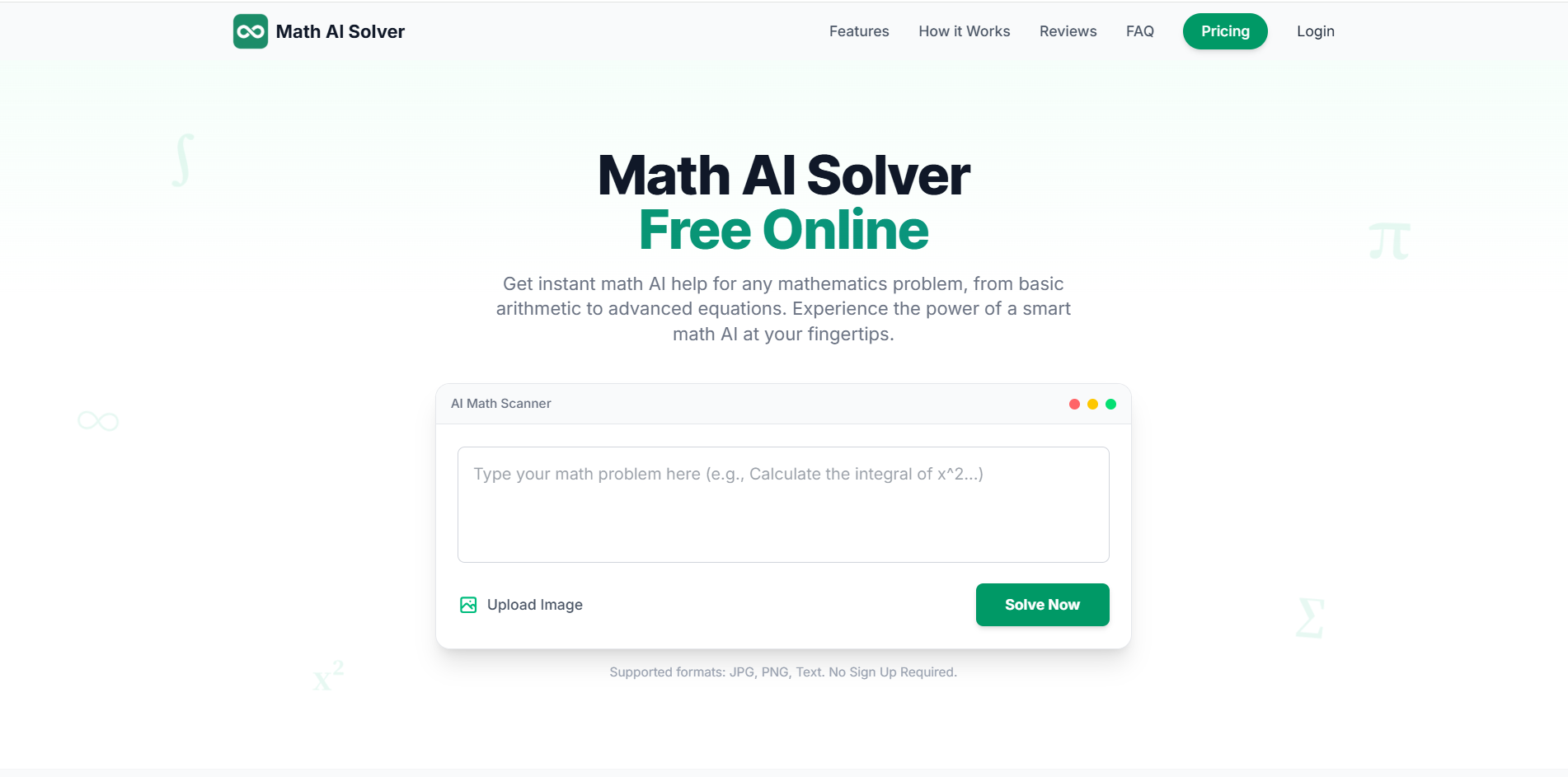 Math AI Solver is a free online AI math problem solver that lets you type or upload images of math problems and get instant, step-by-step solutions for topics from basic arithmetic to advanced calculus — all without signing up.Key Features:Instant Math Solutions: Solve any math problem in seconds with AI-powered step-by-step explanations — MathAI Solver.Photo & Text Input: Upload photos of handwritten or printed problems or type questions directly for automatic recognition and solving.Wide Topic Coverage: Supports basic arithmetic, algebra, geometry, calculus, word problems, and more — from homework to advanced equations.No Sign-Up Required: Start solving instantly on any device with no registration or installation needed.Learn While Solving: A clear breakdown of solutions helps you understand each step, not just get the answer.Use Cases:Instant Homework Help: Get clear, step-by-step solutions for algebra, calculus, geometry, and more in seconds with MathAI Solver — perfect for finishing homework.Photo & Text Problem Solving: Turn handwritten or printed math problems into solved answers simply by snapping a photo or typing your question.Study & Exam Preparation: Deepen understanding and review concepts with detailed explanations that help you learn, not just get the answer.Self-Study & Concept Mastery: Use instant solutions and breakdowns to practice challenging topics and improve your math skills independently.