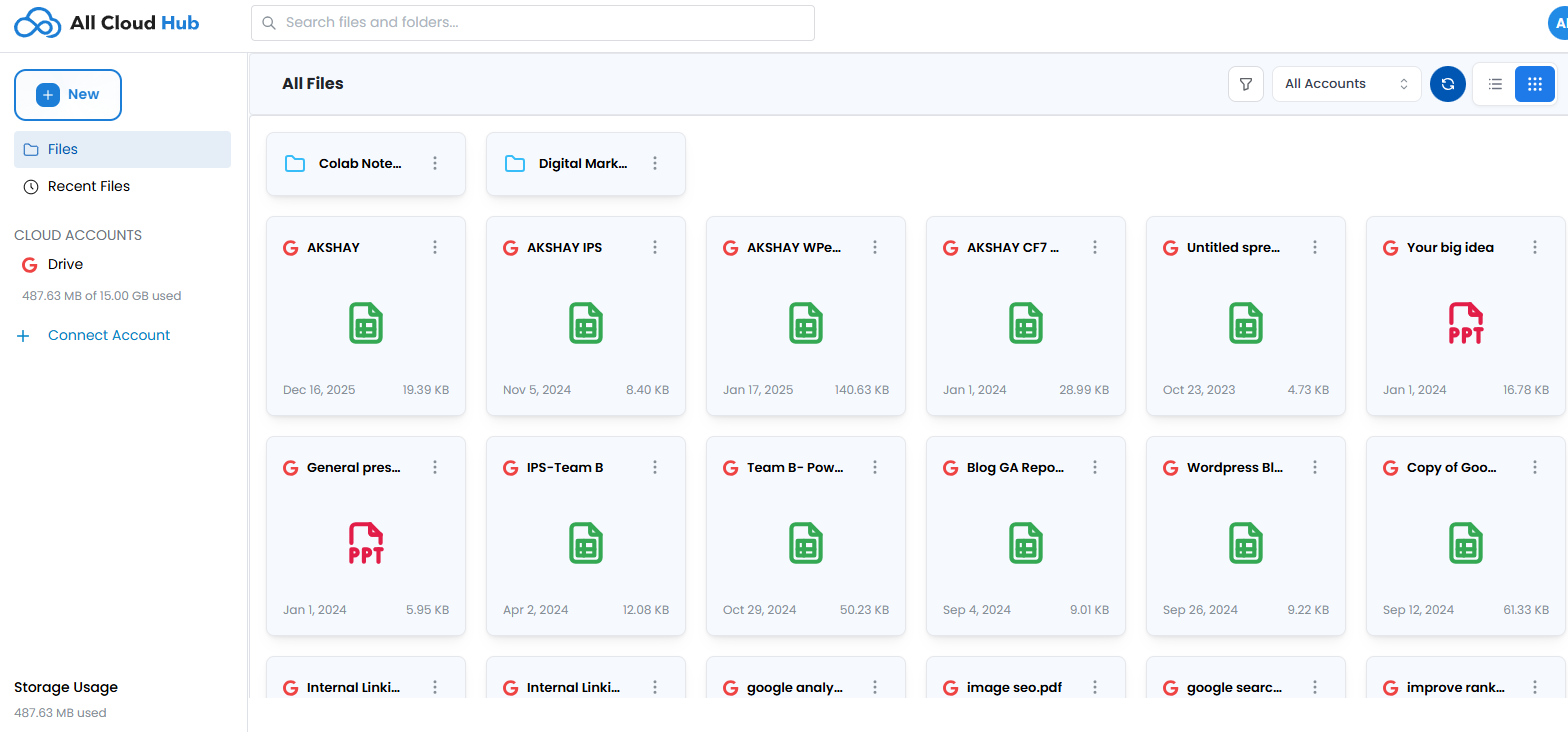 All Cloud Hub is your secure online cloud storage manager that consolidates Google Drive, OneDrive, and Dropbox into one powerful dashboard. Experience seamless cloud-to-cloud transfers, smart search across all accounts, automatic folder sync, and drag-and-drop simplicity. No downloads, no switching tabsβjust unified file management with OAuth 2.0 security. We never store your files; everything stays in your clouds while you gain complete control. Start free with 3 cloud accounts or upgrade for unlimited storage connections and priority support.