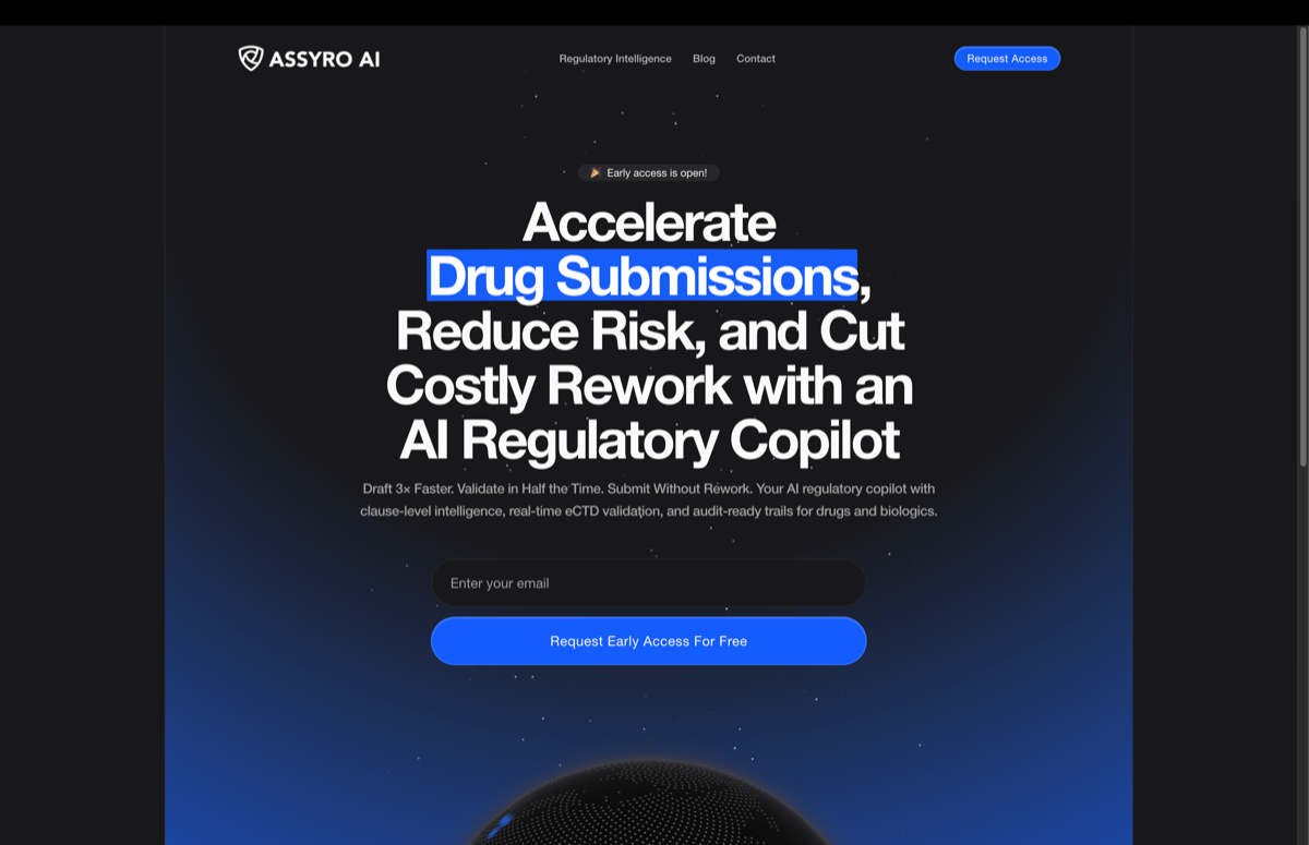 Assyro AI is an advanced regulatory copilot designed for pharmaceutical and biotech teams. It streamlines submission drafting, ensures compliance through real-time eCTD/RPS validation, and maintains audit-ready trails, helping teams stay inspection-ready across drugs, biologics, and medical devices. AI-powered submission drafting and validation Clause-level intelligence and real-time eCTD validation Audit-ready trails for compliance and inspections Supports drugs, biologics, and devices The platform integrates AI to assist in drafting, validating, and managing regulatory submissions efficiently. It offers real-time validation and comprehensive trails to reduce rework and accelerate approval processes. The solution is available on a freemium model, catering to regulatory teams, biotech firms, and pharmaceutical companies seeking to improve compliance and reduce submission times. Benefits include faster submissions, reduced risk of rework, and inspection readiness, making it ideal for teams aiming to optimize regulatory workflows.
