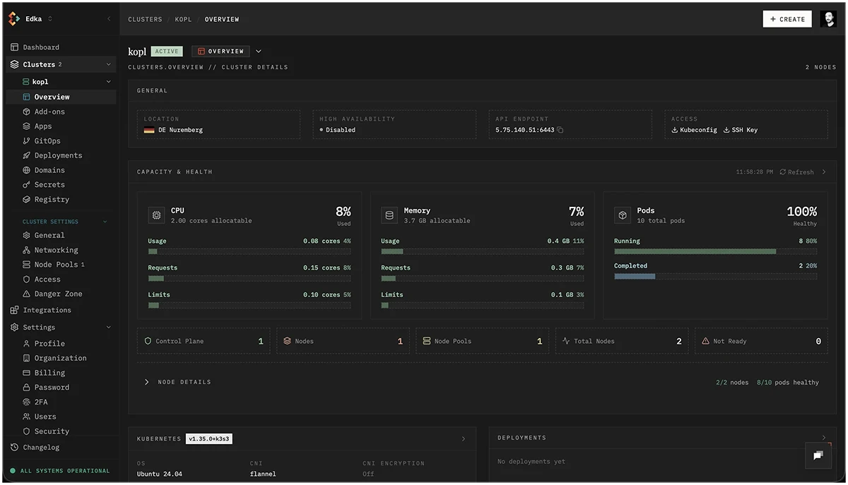 Introduction Edka Kubernetes Platform is a comprehensive solution designed to simplify cloud operations and accelerate application deployment on Kubernetes. It enables users to manage, scale, and optimize their Kubernetes clusters with ease, leveraging full control over their infrastructure while significantly reducing costs. Built on open standards and integrated with popular tools, Edka empowers teams and individual developers to deploy production-ready clusters quickly and efficiently. Features Instant Provisioning & Auto-Scaling: Deploy hardened, production-ready Kubernetes clusters within minutes. The platform supports auto-scaling across regions, ensuring applications can handle variable workloads seamlessly. GitOps Integration: Connect your GitHub repositories for automated CI/CD workflows, enabling smooth code deployments, preview environments, and seamless rollouts to production environments. Extensible Add-ons: Install a variety of one-click add-ons such as databases, ingress controllers, observability tools, and more, allowing customization of infrastructure to meet specific needs. Built-in Monitoring & Analytics: Gain real-time insights into cluster performance, resource utilization, and costs through integrated dashboards, facilitating proactive management and optimization. Secure Backups & Data Management: Plan for disaster recovery with upcoming features that enable backup and restore of clusters, databases, and persistent volumes to S3 with a single click. Cost Efficiency & Full Control: Manage clusters within your own Hetzner account, paying Hetznerβs list prices often up to 70% lower than major cloud providers like AWS or GCP. The platform offers transparent cost management, no vendor lock-in, and the ability to detach and retain workloads independently. Use Cases Startups & Small Teams Startups like Aicole migrated from costly Azure infrastructure to Edka, achieving a 64% reduction in operational costs while maintaining performance and reliability. The platformβs quick provisioning and auto-scaling features enable small teams to deploy applications rapidly without extensive infrastructure management. Enterprises & Growing Businesses Organizations such as TROI Ticketing Solution utilize Edka for scalable, cost-effective infrastructure. They benefit from automated deployments, real-time monitoring, and the ability to manage large user bases with minimal overhead, allowing their developers to focus on application development rather than infrastructure concerns. Benefits Cost Savings: Reduce cloud expenses by up to 70% compared to traditional providers, while maintaining full control over resources. Time Efficiency: Deploy production-ready clusters in minutes, enabling faster go-to-market times and continuous delivery. Flexibility & Control: Manage clusters within your own Hetzner account, detach workloads at any time, and avoid vendor lock-in with open standards. Ease of Use: Simplify Kubernetes management with one-click add-ons, integrated monitoring, and automated workflows, making complex operations accessible to teams of all sizes. Conclusion Edka Kubernetes Platform offers a powerful, cost-effective, and user-friendly solution for managing Kubernetes clusters. Whether you are a startup, a growing business, or an enterprise, Edka helps you deploy, scale, and optimize your infrastructure efficiently. Explore its features further to transform your cloud operations and accelerate your application delivery.